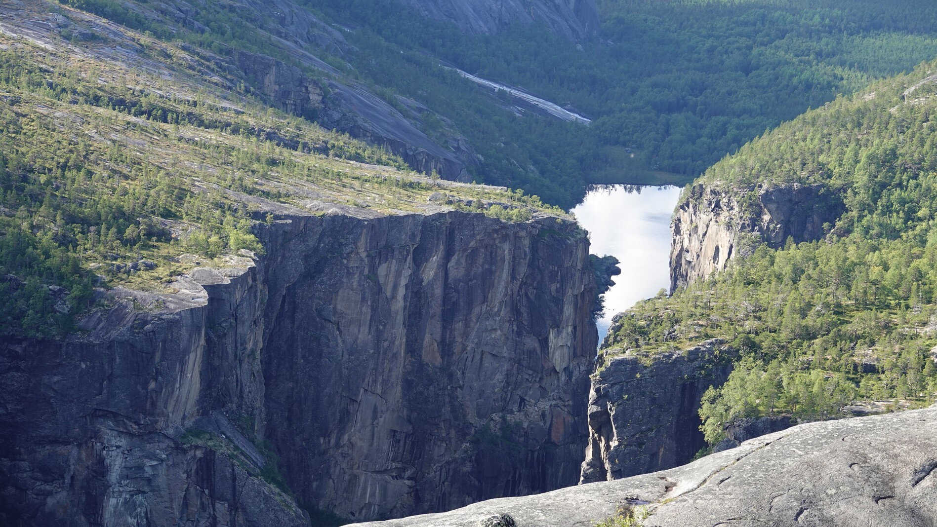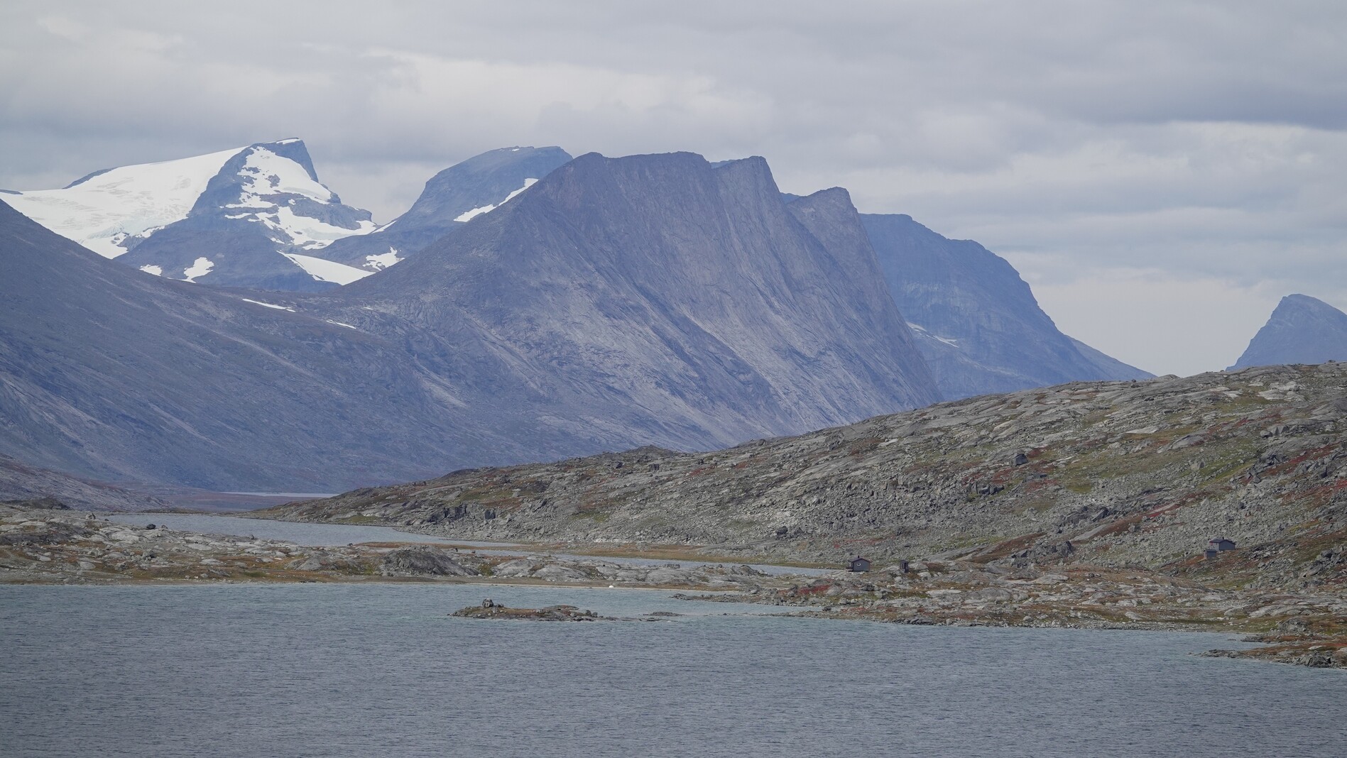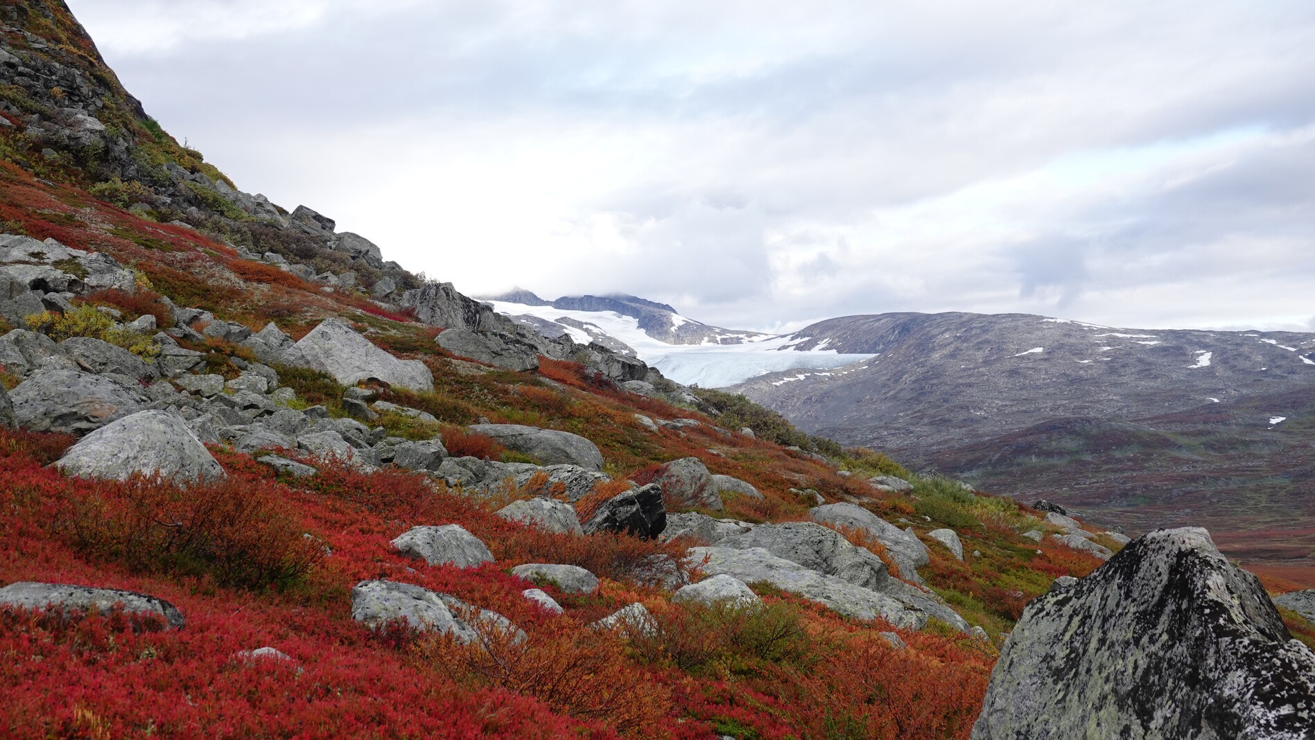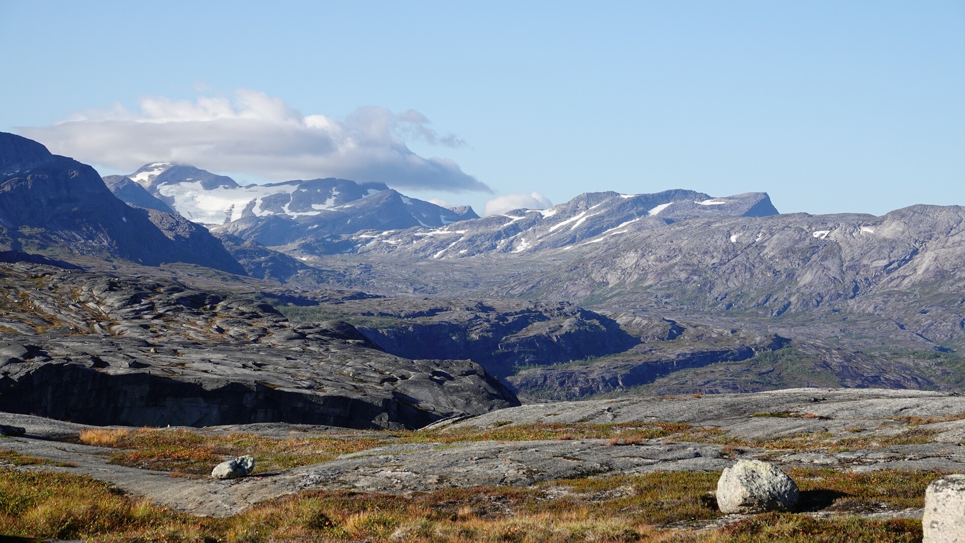 After descending over a plateau, we reached a pass where we had a beautiful view over a deep down valley at the end of which lies a fjord. We had to descend into it until we reached a hiking trail, which climbed up again. The valley in which the fjord lies forms an impressive canyon with steep walls.