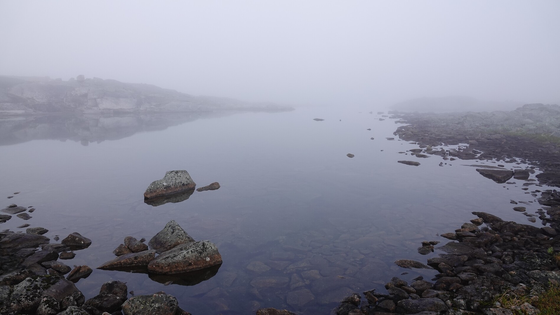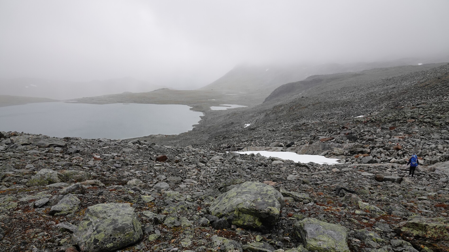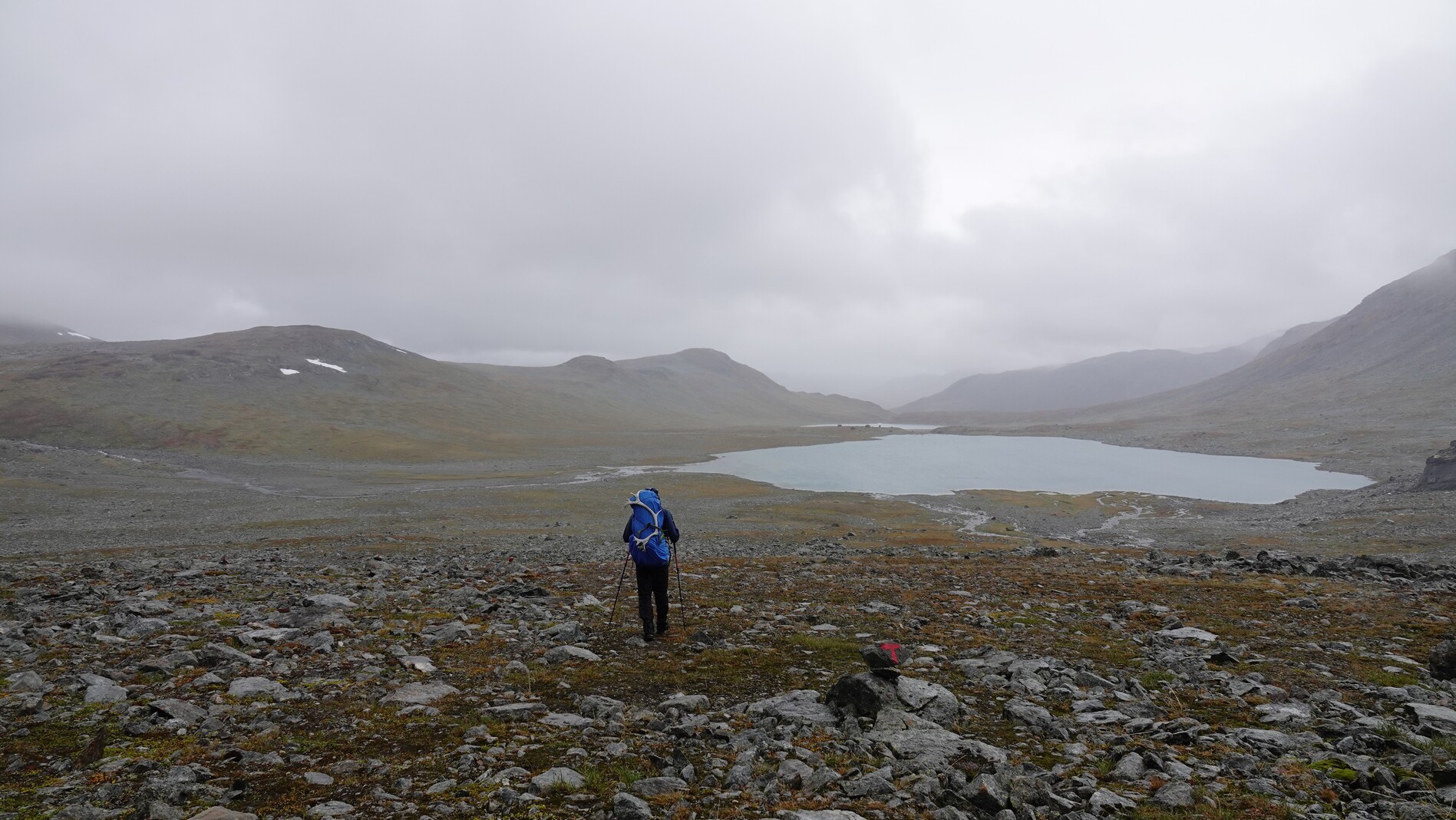 The day started with a thick fog, which fortunately lifted after a while and made way for sunshine. The whole day we followed a path marked somewhat well by cairns. Sometimes there was a visible trail, sometimes not.