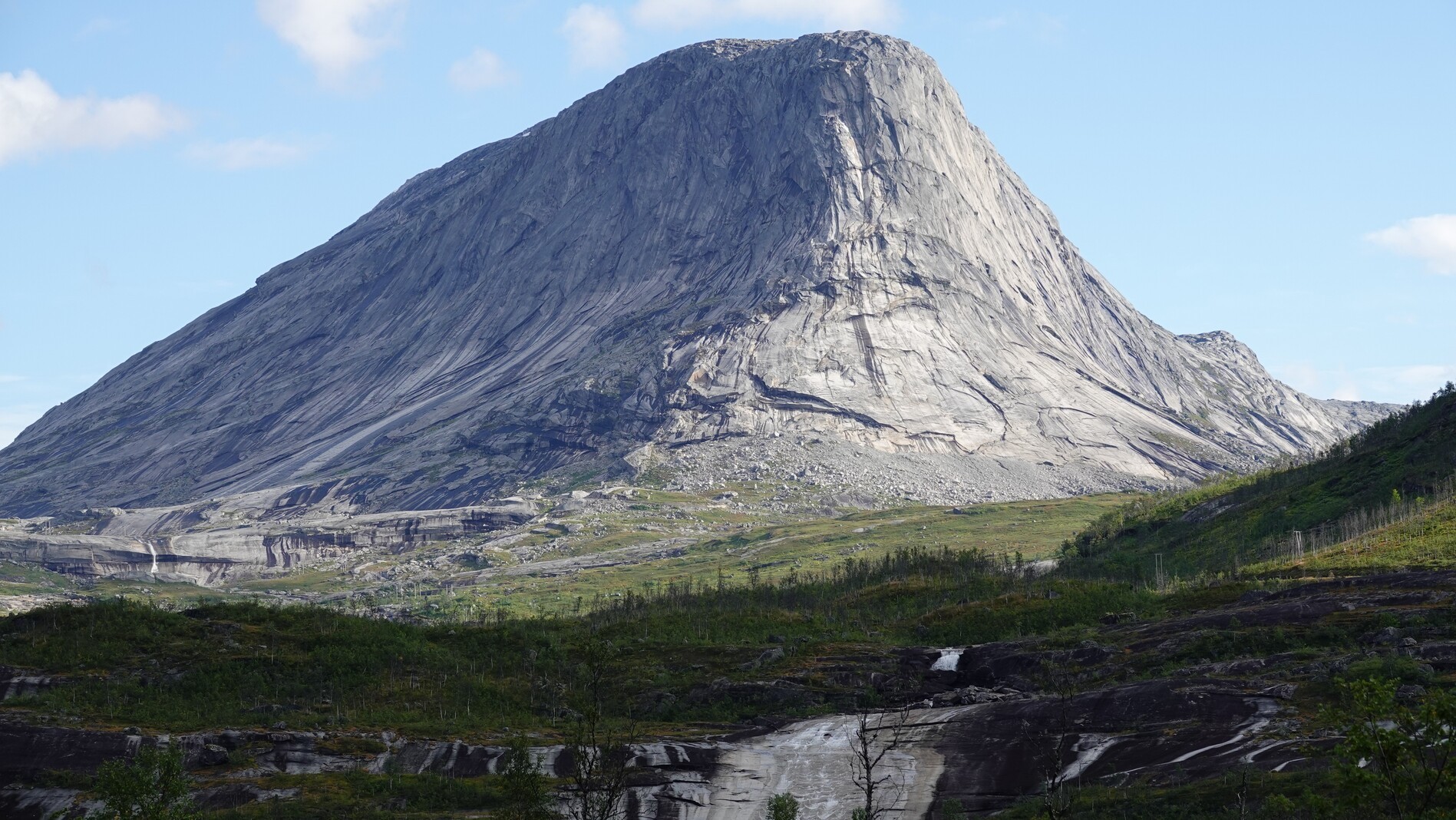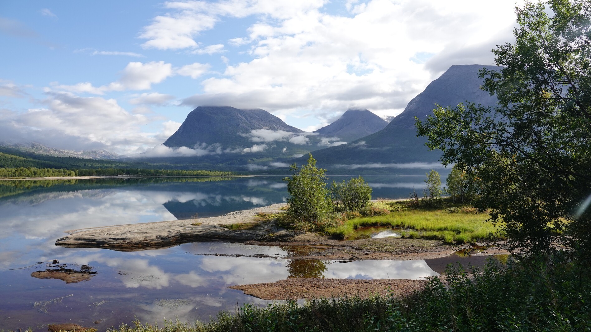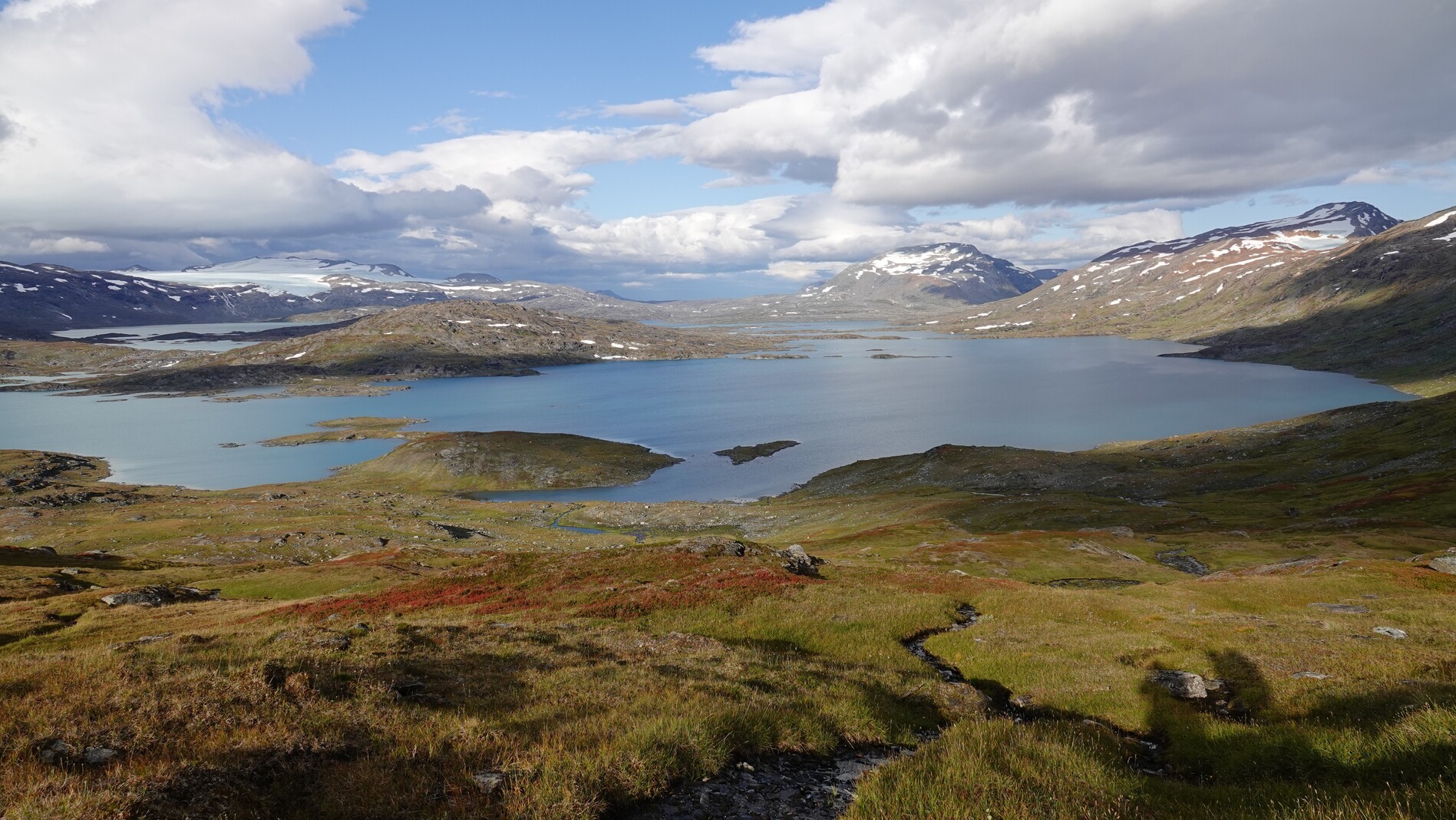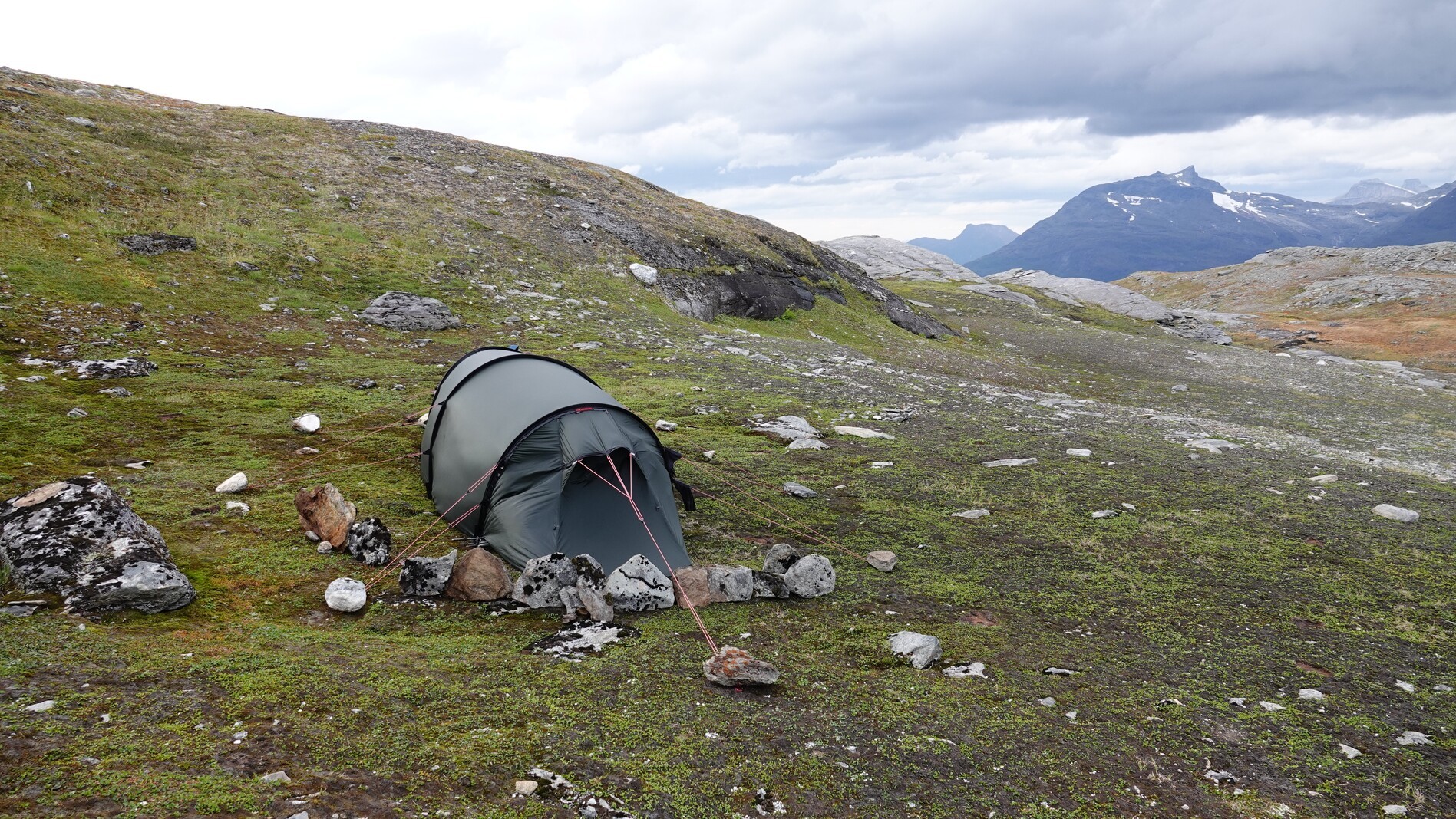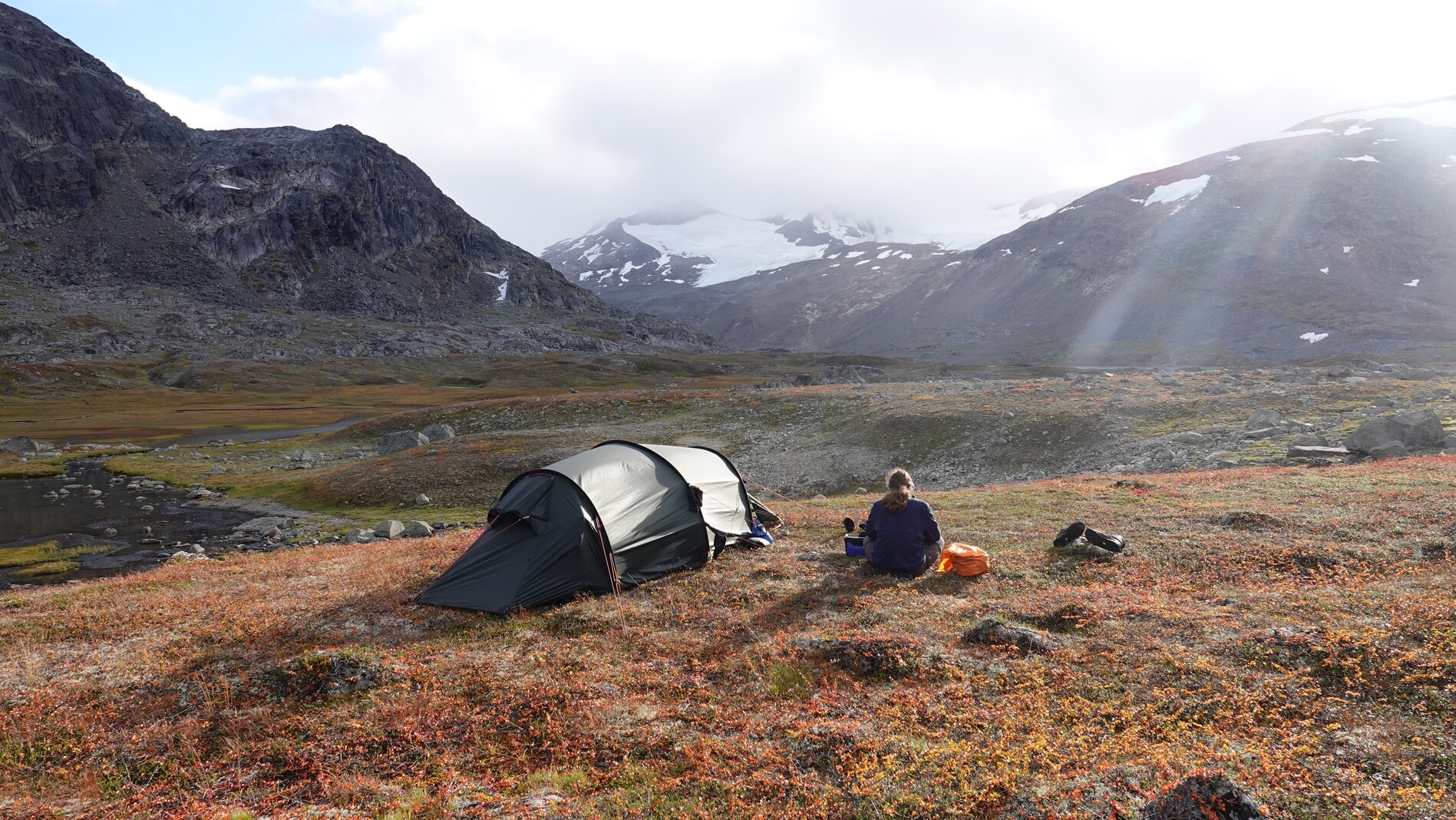 We arrived via bus at the start of the tour, a little camping ground at the Kobbvatnet lake. The first 14 kilometers we hiked up a valley on a street. After the trail left the street, it quickly became non-visible, and we lost it. A bit further uphill, we found a good camping spot besides a river.
