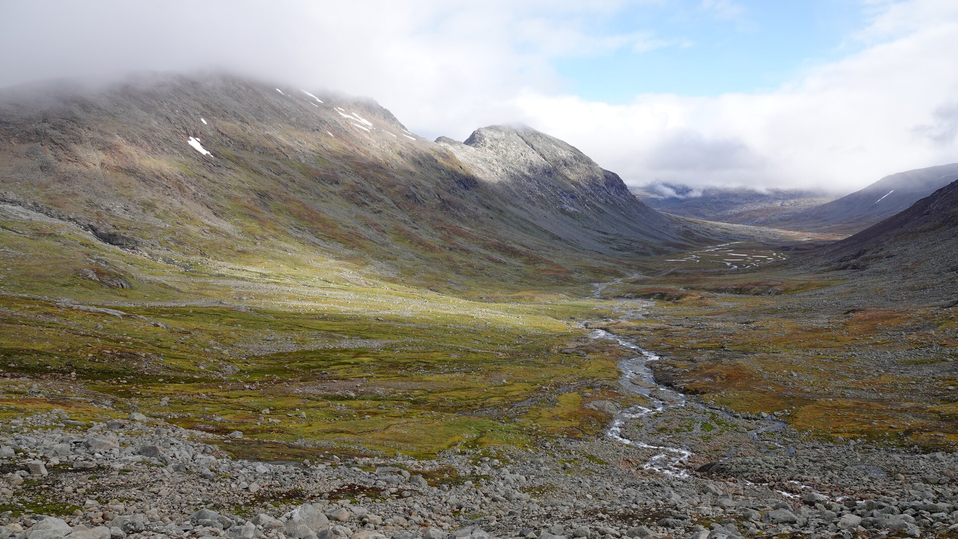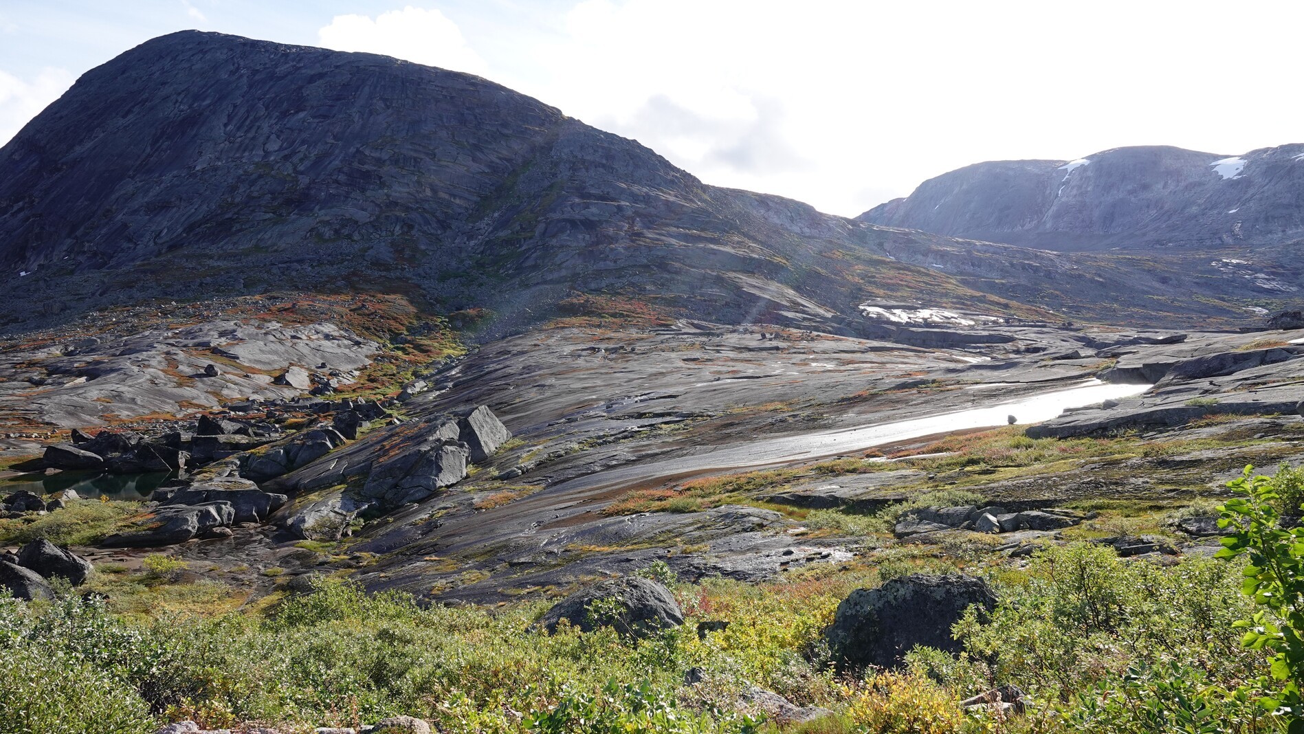 We walked in the next valley. Up to the pass, the path was well-marked, which helped a lot as the terrain was quite steep and rutted. After the pass, the path was gone, and we had to find our own way through the rocky landscape. We also had a good view at the melting Gihtsejiegnja glacier and later that day found some big reindeer antlers. At the end of the day we could see the bridge we wanted to avoid two days ago. It was still standing and looked good.