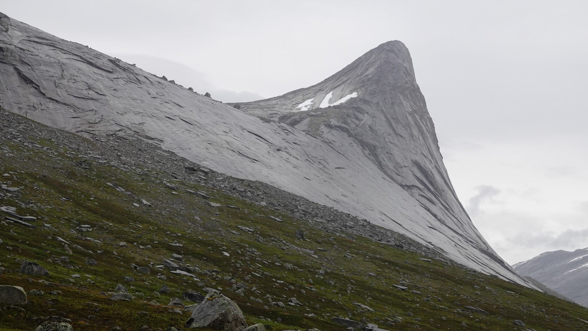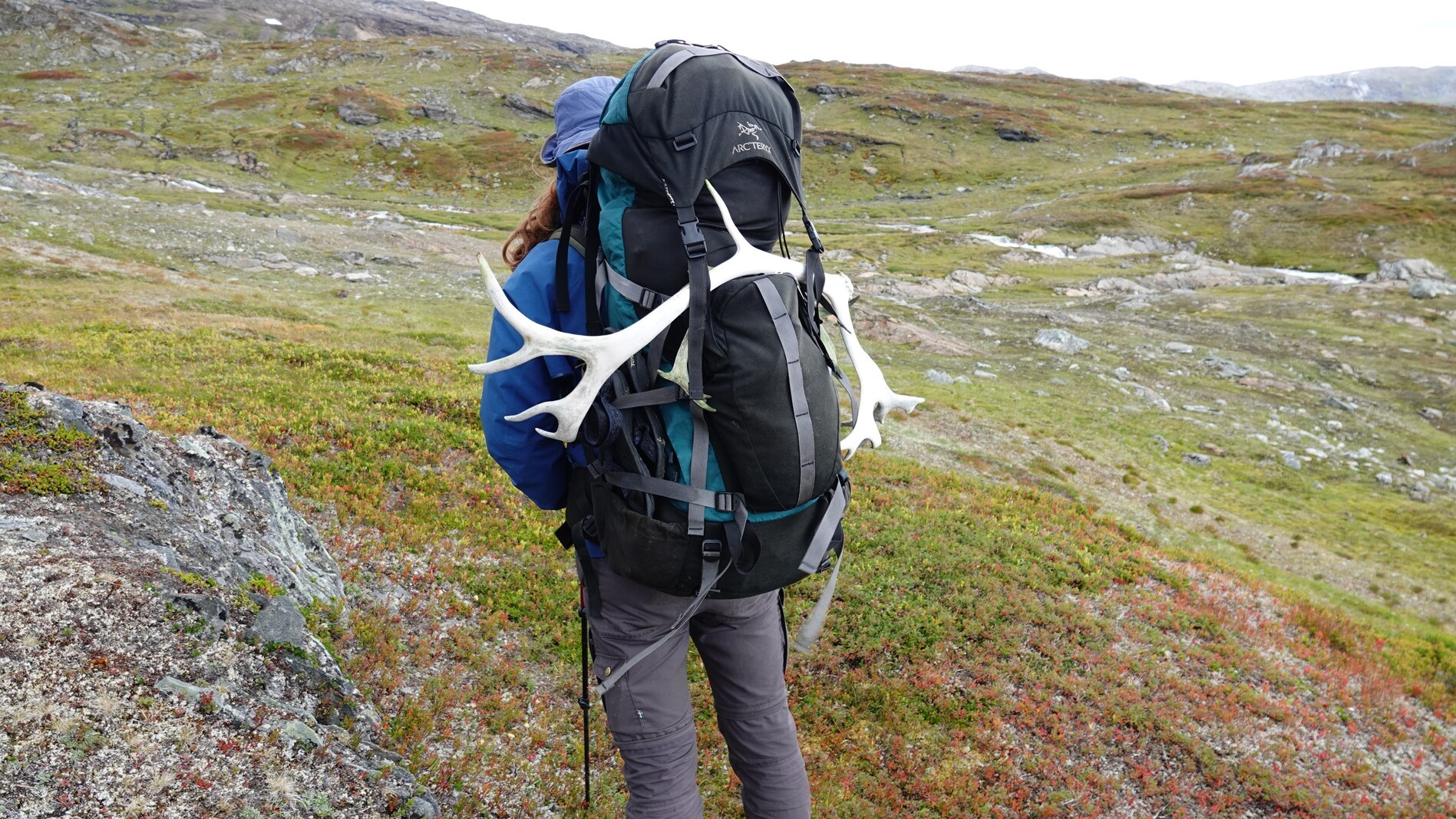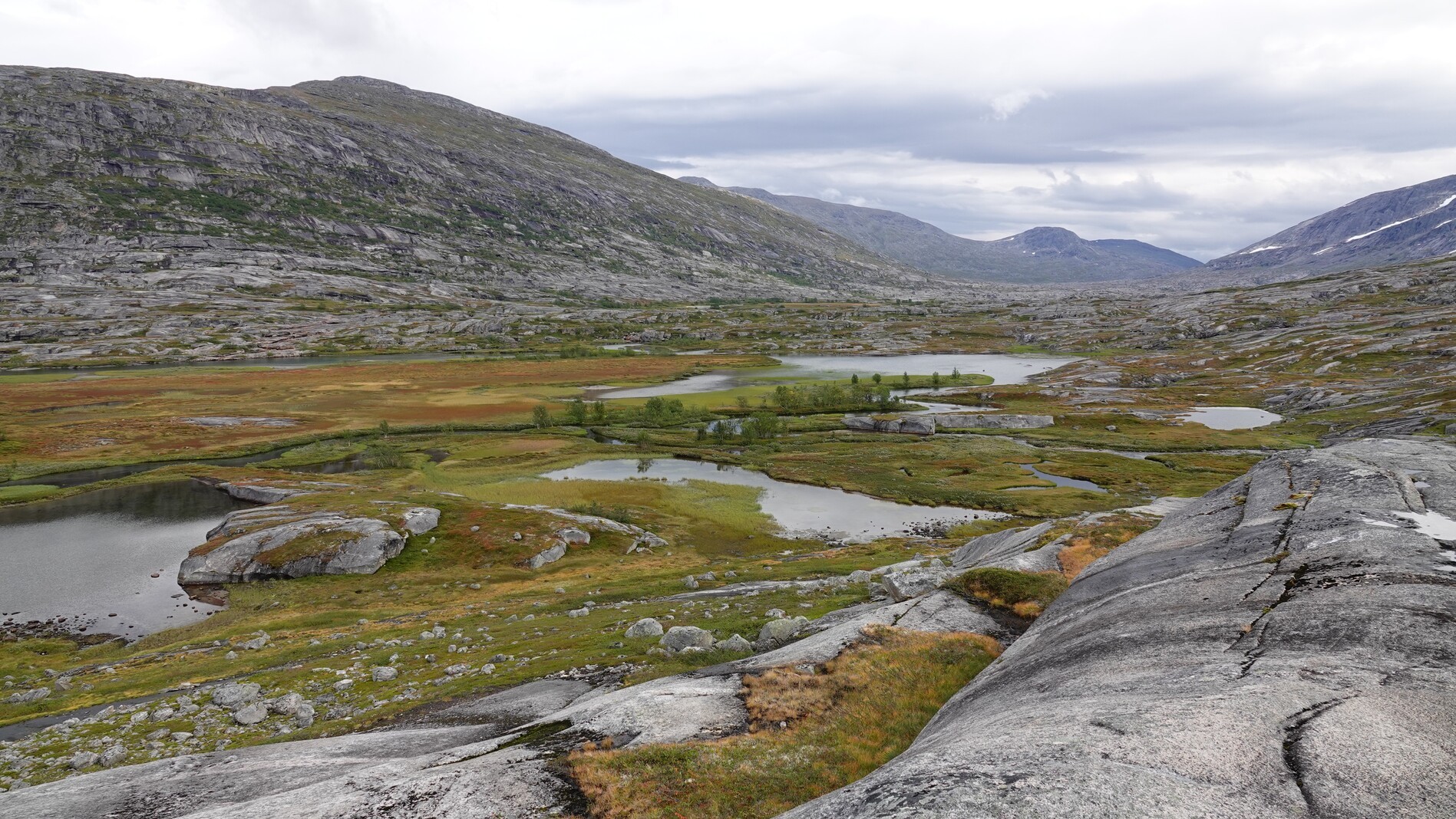 We continued our ascent to a mountain pass, surrounded by strikingly smooth rock formations unique to this region. Over the next few days, these landscapes will become a familiar sight. This day we saw some trail markers, but they were quite sparse, and no trail was visible. By evening, we camped on a peninsula in a valley, where a meandering river had carved out several lakes.