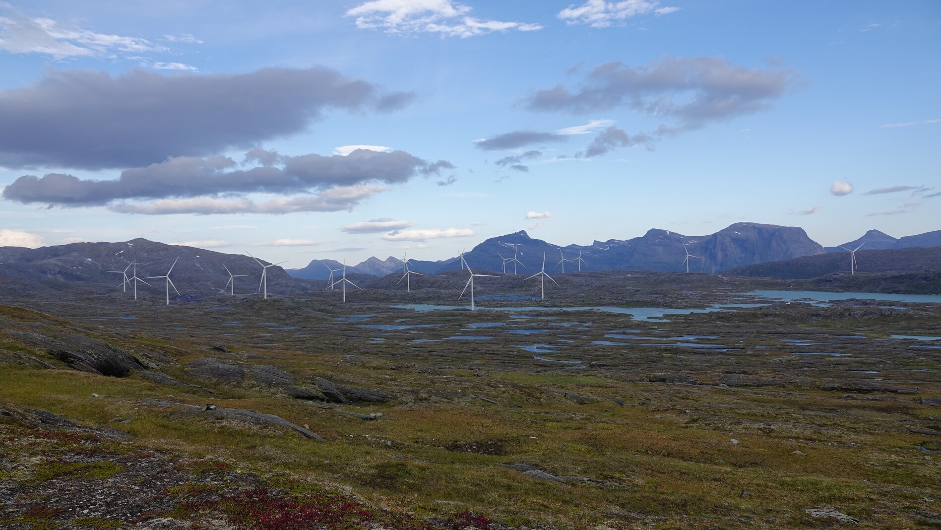 We chose the longer route to the left around the Gihtsejiegnja glacier, since the path to the right included a major bridge crossing. Several bridges we encountered in recent days had been destroyed. After we crossed a high plateau with a wind park and an adjacent water reservoir, the wind picked up considerably. A few times it almost blew me over, and we built our tent a small wind wall.
