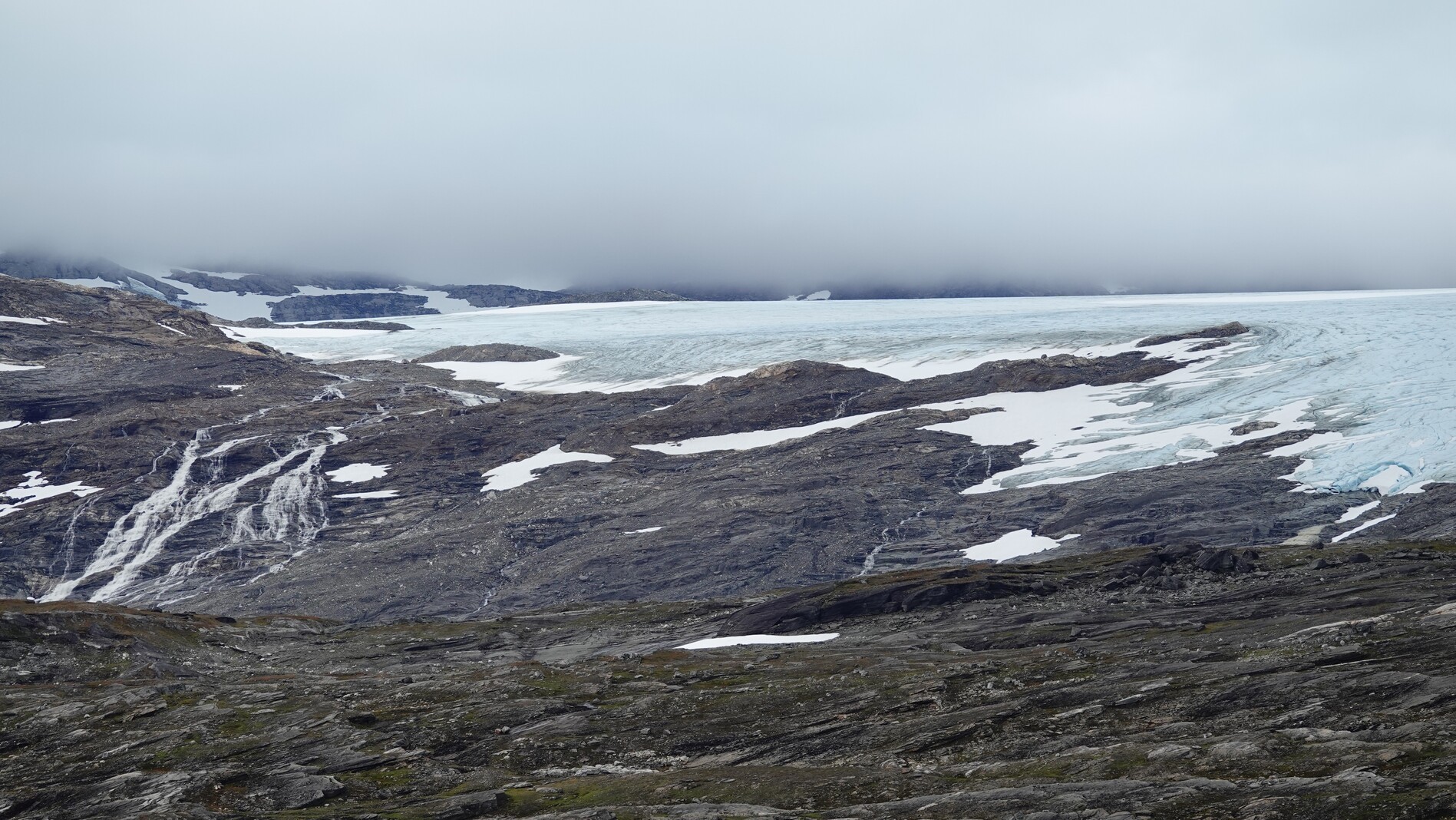 Fortunately, the weather cleared up in the morning, and we walked into a beautiful high valley with steep hillsides on both sides. After the pass we crossed a glacier tongue. The glacier here was approximately 20 meters less thick than on our map from 2017.
